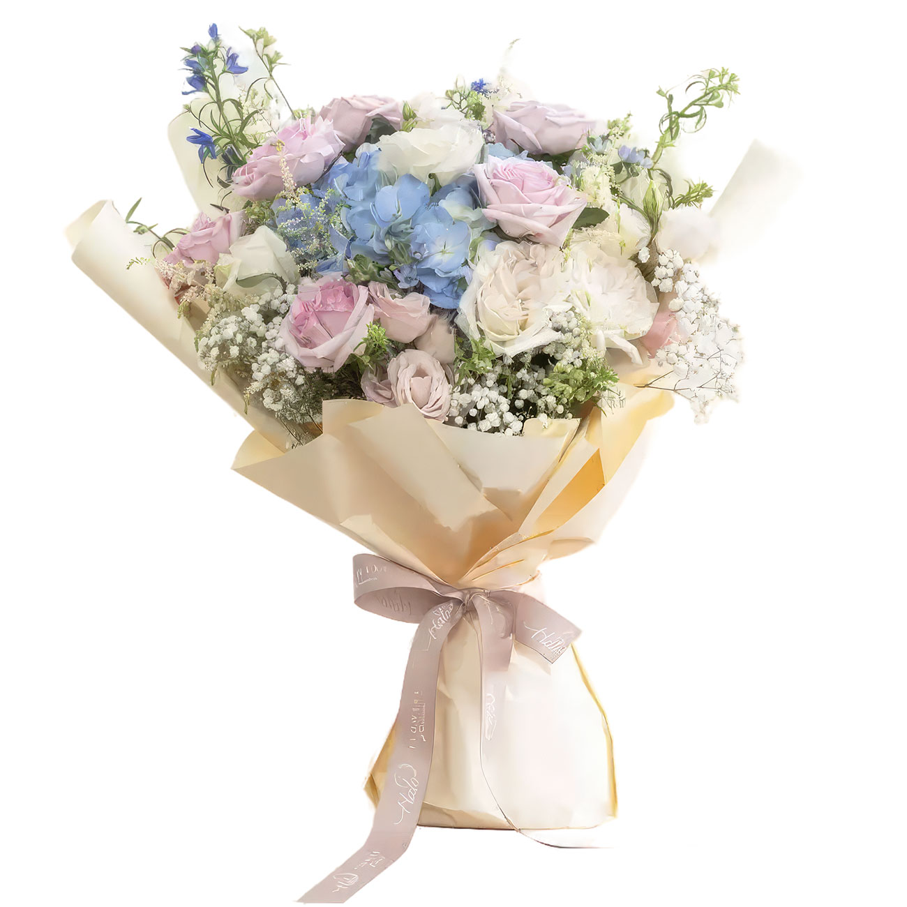 Гортензия голубая, роза сорта «Личи» сиреневая, роза сорта «Личи» белая, «Снежная гора», эустома розовая, гипсофила. Упаковка (лента, пленка, крафт, сетка, пленка матовая)