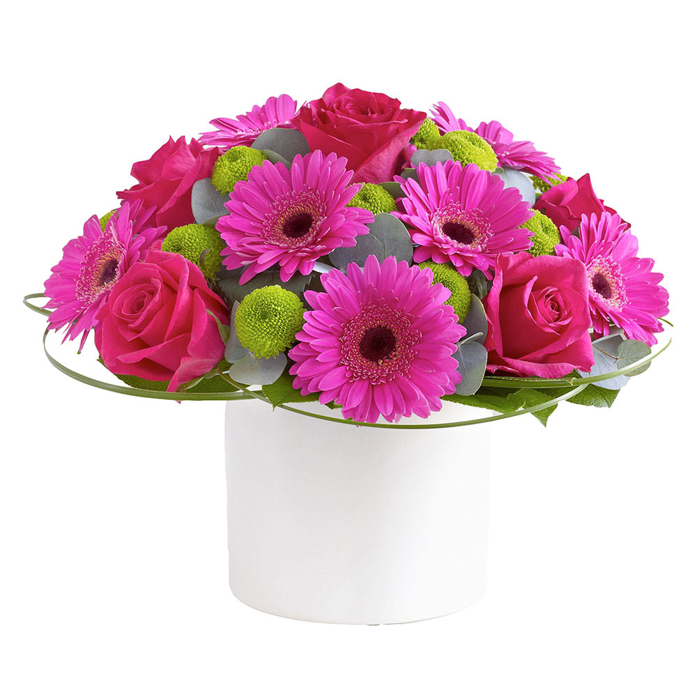 Гербера розовая, роза одноголовая розовая, хризантема кустовая зеленая, эвкалипт. Упаковка (шляпная коробка, квадратный бокс, коробка сердце, оазис)